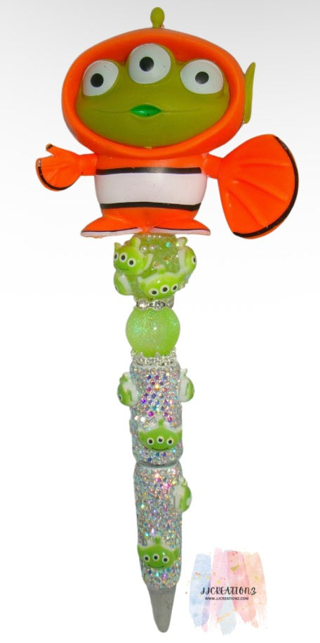 Bring a playful pop of personality to your writing! This adorable alien-themed pen features a vibrant three-eyed alien topper dressed in an orange sea-creature outfit, paired with sparkly rhinestone details and mini alien accents throughout the barrel.