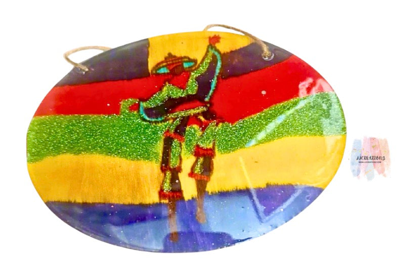 Add a bold and cultural statement to your home with this hand-painted moko jumble-inspired wall hanging. Featuring a vibrant design with red, yellow, green, and black tones, this unique piece showcases a traditional figure in motion, symbolizing strength, pride, and artistry. Finished with a glossy protective coat, it’s ready to brighten any space.